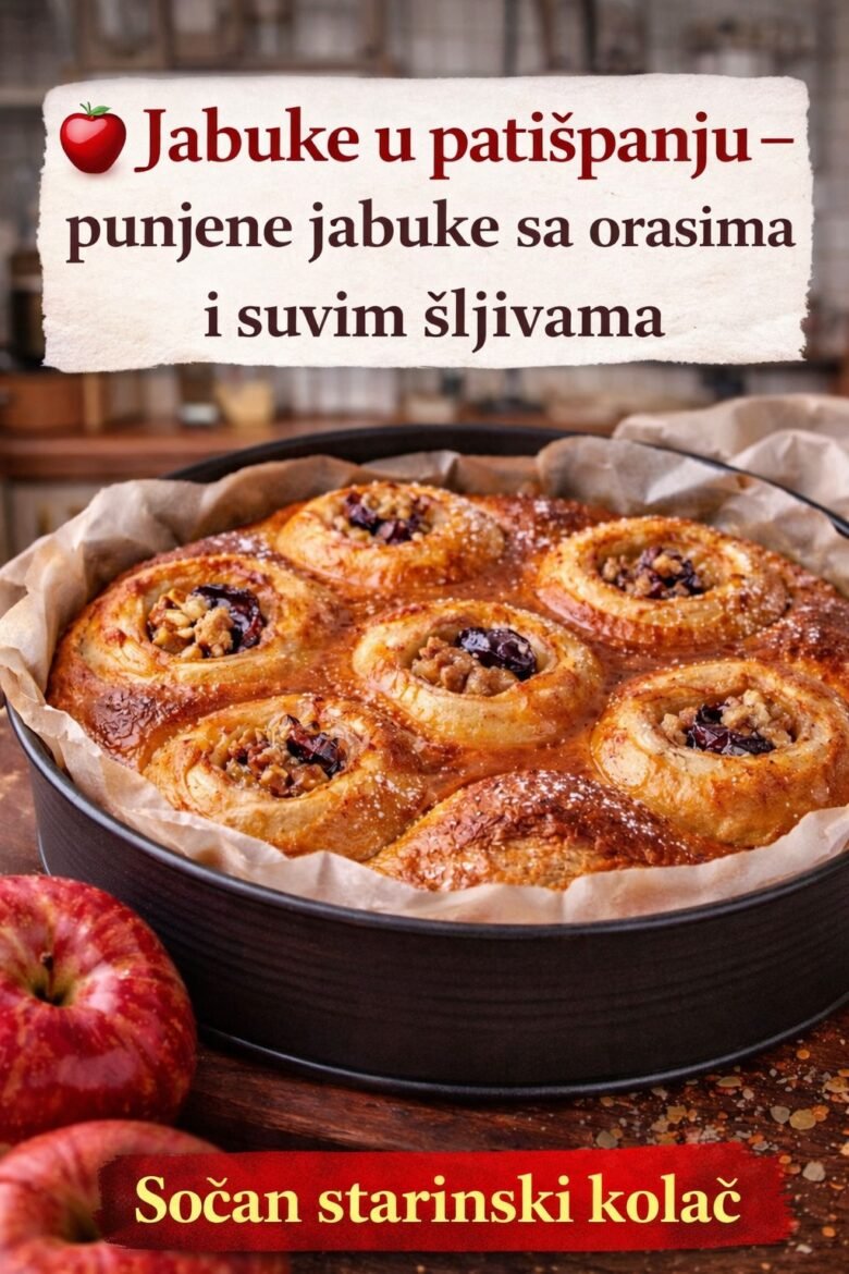 U činiji pomešajte orahe, seckane suve šljive, šećer i cimet. Ovom smesom napunite svaku jabuku do vrha.